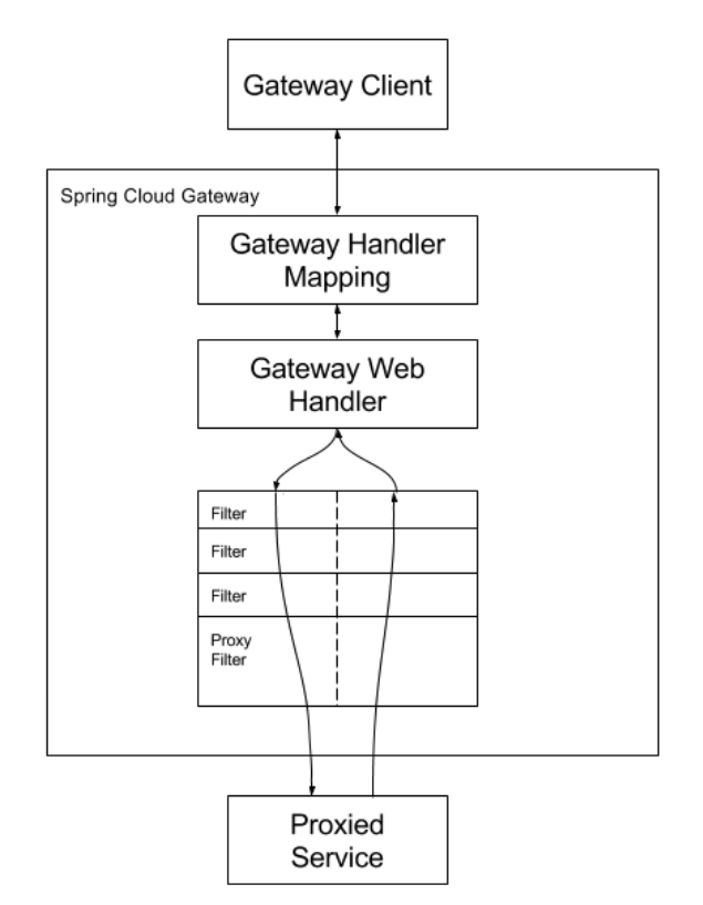 클라이언트에서 게이트웨이에 요청을 보내면 Gateway Handler Mapping에서 요청에 맞는 route를 찾아서 Gateway Web Handler에 보낸다. 이 핸들러가 요청을 필터 체인애 보내고, 필터 체인은 프록시 요청을 주고(pre-filter) 받을(post-filter) 때 모두 로직을 실행시킬 수 있다.